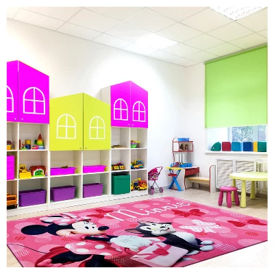 Pretty in Pink, this Minnie Mouse oversized area rug will brighten up any room for Minnie fans of all ages. Featuring Minnie and her feline friend Figaro, this beautifully designed Jumbo Rug measures 4’6″ X 6’6″ and is Digitally Printed providing great color and detail. Perfect for your bedroom, playroom or your very own “Boutique”, this rug is sure to warm up any room.