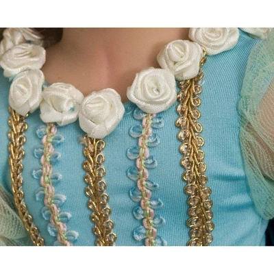 Victorian costumes of the late 1800s inspire this gorgeous blue ballet costume. With layers of gauzy fabric, the skirt is trimmed with satin ribbons, braids and satin roses. The separate bodice and headband are detailed with gold and blue floral braid and cream roses. Tights and golden satin ballet shoes included.