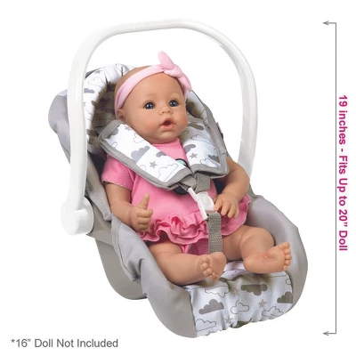 Ready for a twinkle adventure? ADORA’s Twinkle Stars Baby Doll Car Seat is a must-have doll accessory for all doll lovers! This baby doll car seat can easily fit most plush toys, stuffed animals, and dolls up to 20 inches in length like our ToddlerTime Dolls or our 16 Adoption Babies collection.Adora Twinkle Stars Car Seat features a dreamy gender-neutral grey & white cloud print with glitter star accents. This doll car seat is not only ADORAbly stylish but also functional”your baby doll can be easily carried by its sturdy white handle that also rotates to become a stand! Adoras Twinkle Stars Baby Doll Car Seat has a 100% Machine Washable removable seat and safety straps so your little ones toy is snug, safe, and ready for an adventure! Buckle in your favorite Adora doll in this gender-neutral car seat and watch your parent-in-training nurture & care for their baby during travel. Doll pictured is sold separately.