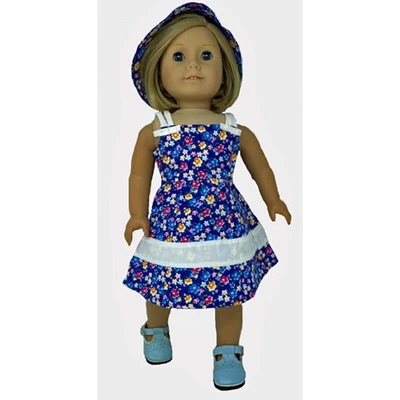 Doll Clothes Superstore Matching Girl And Doll Flower Sundress Size 10Dark blue background with small flowers makes an attractive sundressCotton blend fabric has a border of white on the hemlineWhite spaghetti straps with bows at the bodiceThe doll sundress fits 18 inch girl dolls like American Girl Our Generation My Life dollsAlso fits 15-16 inch baby dolls Please check these measurements before orderingWhen lying flat the dress measures 14 1/2 inches from side to side at the empire waistIt measures 32 inches from the shoulder to the hemThis listing is for one child and one doll dressThe doll and shoes are not included