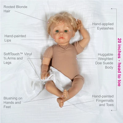 Frog Prince includes a frog-themed ensemble featuring a soft jersey knit green shirt with Frog Prince print and a frog-spotted jersey knit pants. Smooth away his blonde hair wisps from his forehead and style it with his golden yellow knit beanie. Every second with this boy is a moment to be cherished. Give Frog Prince a cuddle as he takes his magnetic pacifier between his lips while hugging his soft frog lovie blanket with tender love! Paradise Galleries Frog Prince lovingly sculpted by world-renowned doll artist Pat Moulton. This realistic toddler boy doll is 20 inches from head to toe, crafted from SoftTouch Vinyl with a weighted cloth body for that wonderfully lifelike feel with a fresh baby powder scent. Arriving in a Collectors Box along with a numbered Certificate of Authenticity with the artists signature. Intended for reborn doll collectors aged 3+.