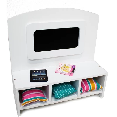 Comfy, cozy, and modern! Your doll’s dream house wouldn’t be complete without this sectional sofa, coffee table, and entertainment center. It has all the items needed to make a house a home and everything you need to ensure movie night is a blast. Curl up on the couch with a magazine or tablet, and don’t forget the dog too! Along with a full entertainment center with a built-in television, this set comes with a sectional sofa, cushions, throw pillows, and multiple doll accessories ranging from a tv remote to an adorable dog to cuddle. This set has a sturdy wood structure and a glossy white finish, giving them a timeless style and lasting strength.