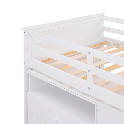 - [Versatility Galore] There is an independent movable desk under the bed. The desk has five drawers that can be pulled out and an open shelf. The drawers can hold odds and ends, and the shelf can hold books, practicality very strong, meet the needs of your learning.